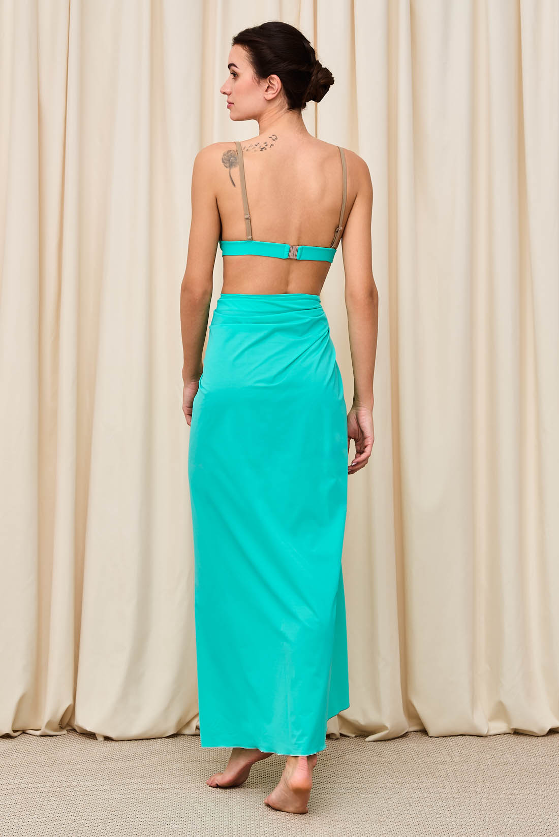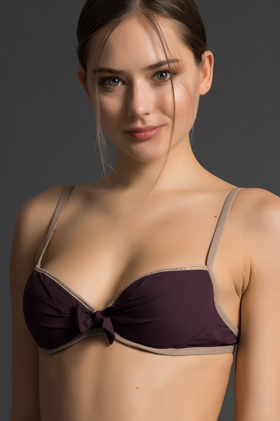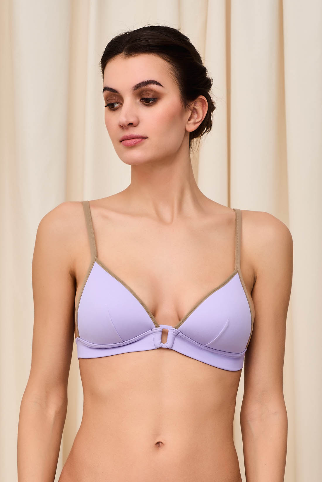 Reggiseno mare in morbida Lycra super opaca con coppe a triangolo imbottite, finitura color cocco. 77% Poliammide 23% Lycra.