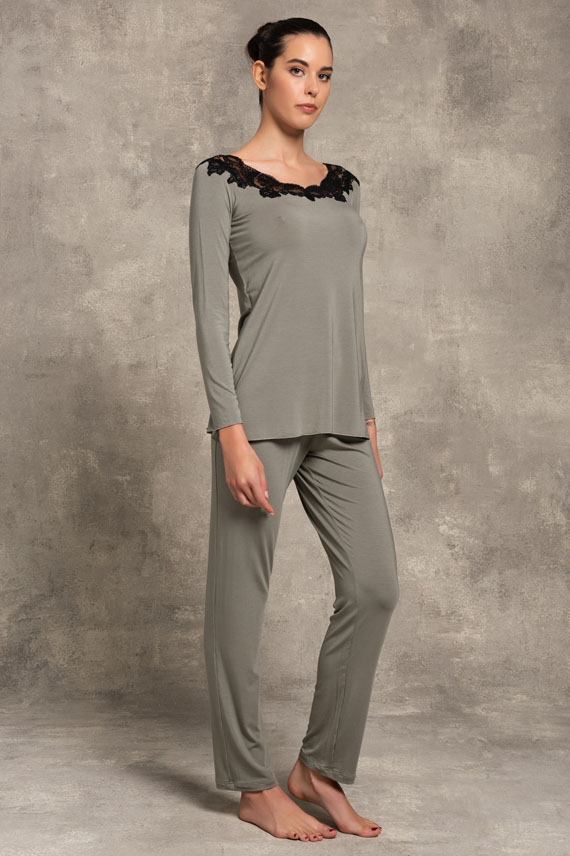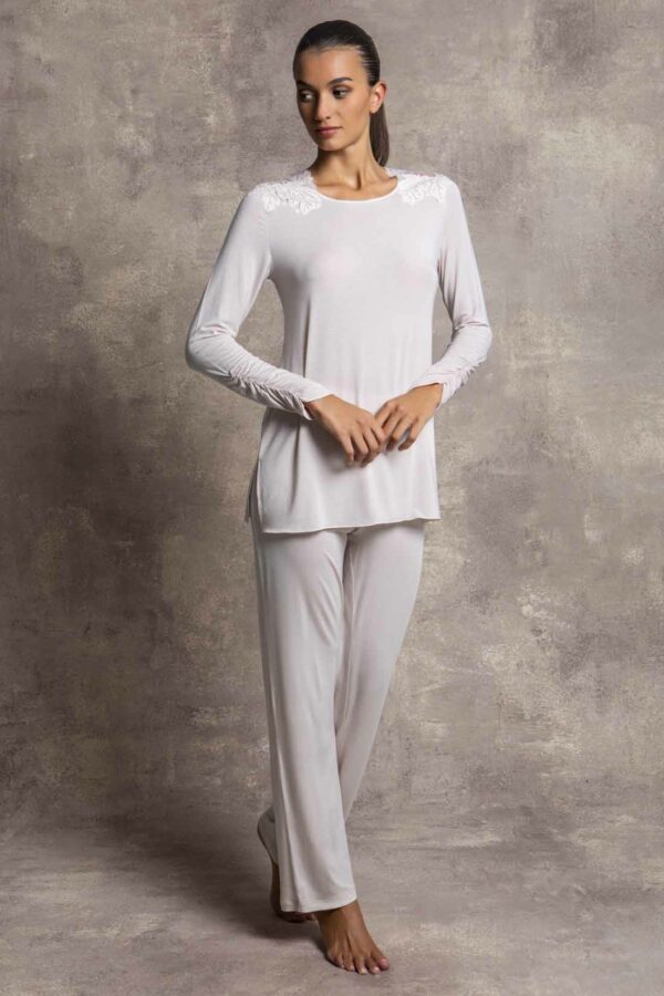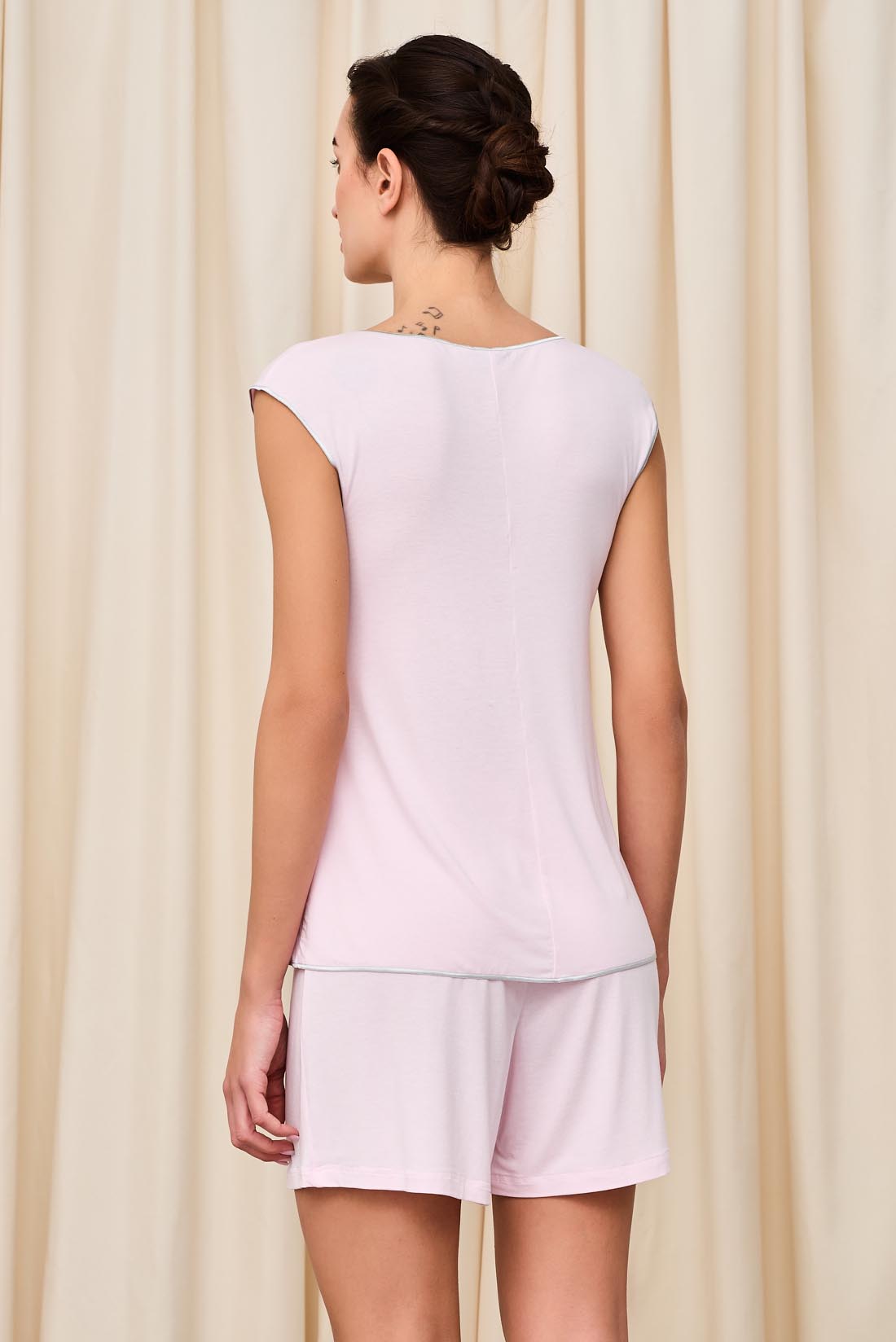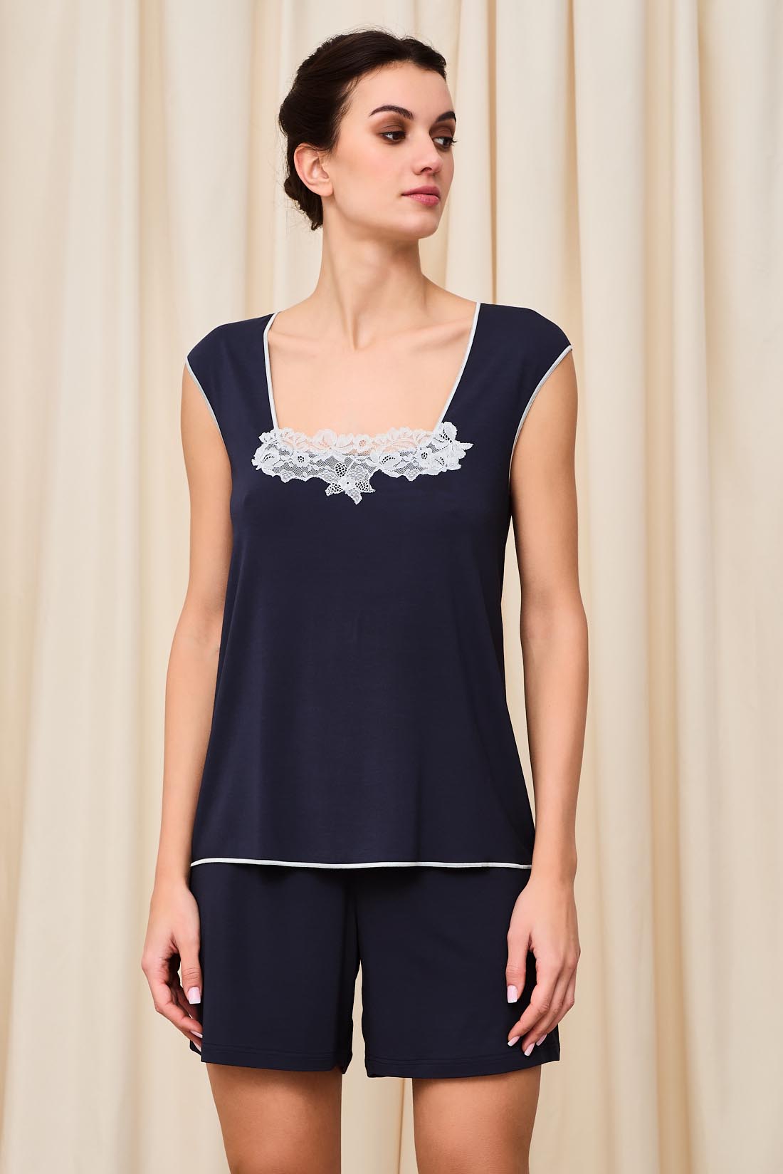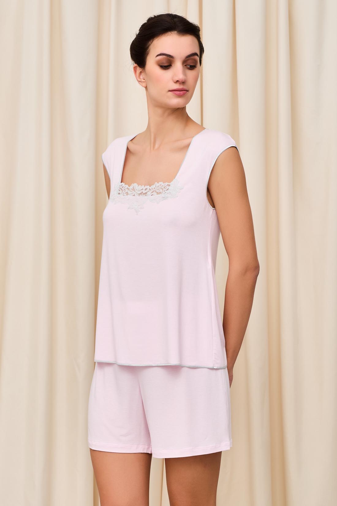 Morbido pigiama a spalla larga elasticizzato. Decolleté impreziosito da inserto in pizzo elastico a disegno floreale. Pantaloncino corto. 93%modal 7%elastam.