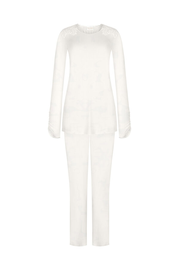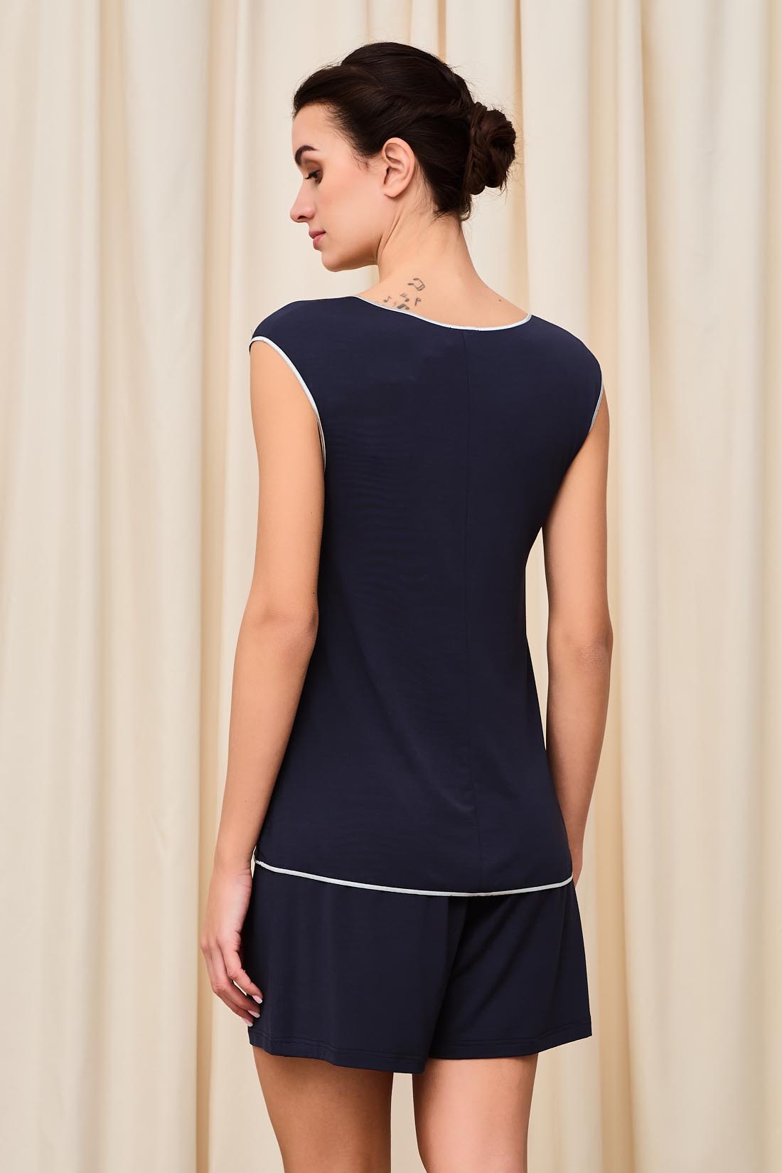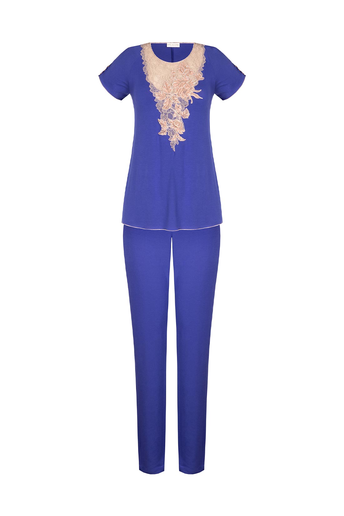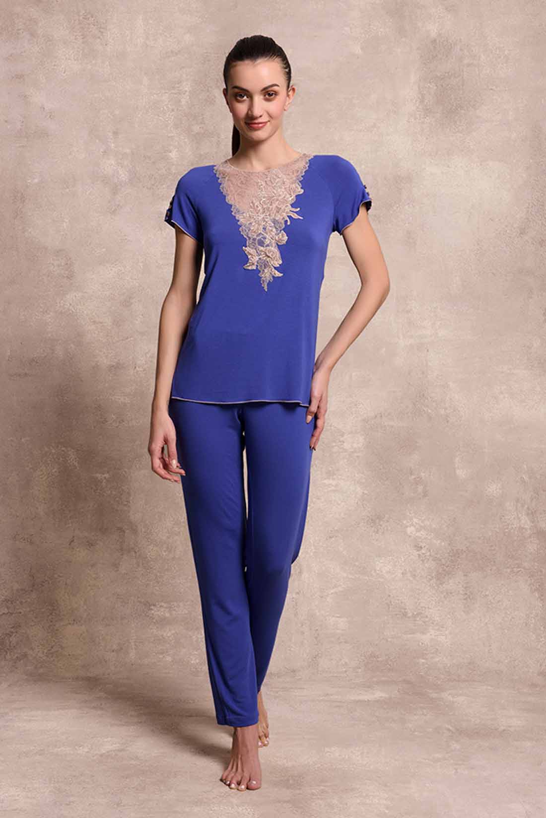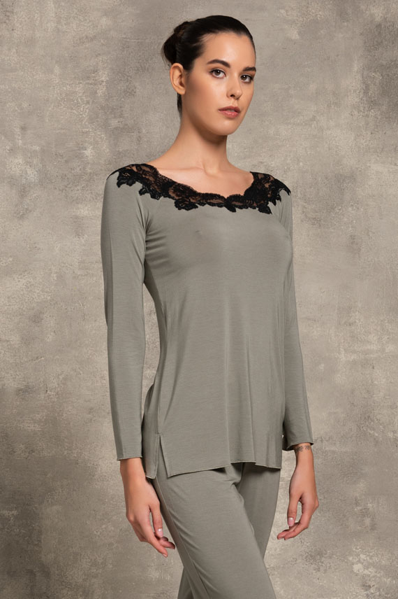 Morbido pigiama a spalla larga elasticizzato. Decolleté impreziosito da inserto in pizzo elastico a disegno floreale. Pantaloncino corto. 93%modal 7%elastam.