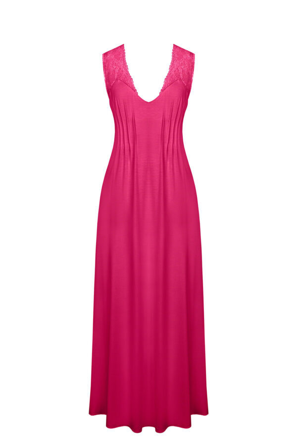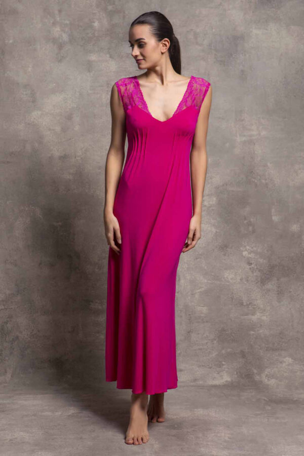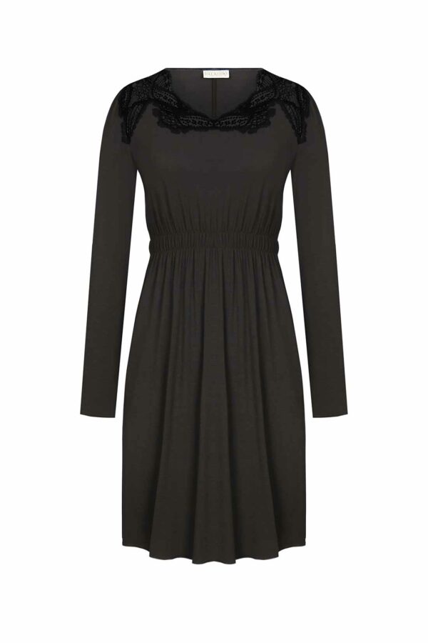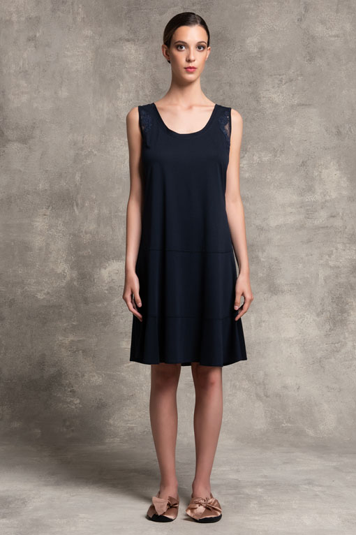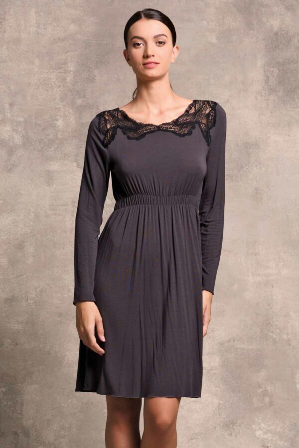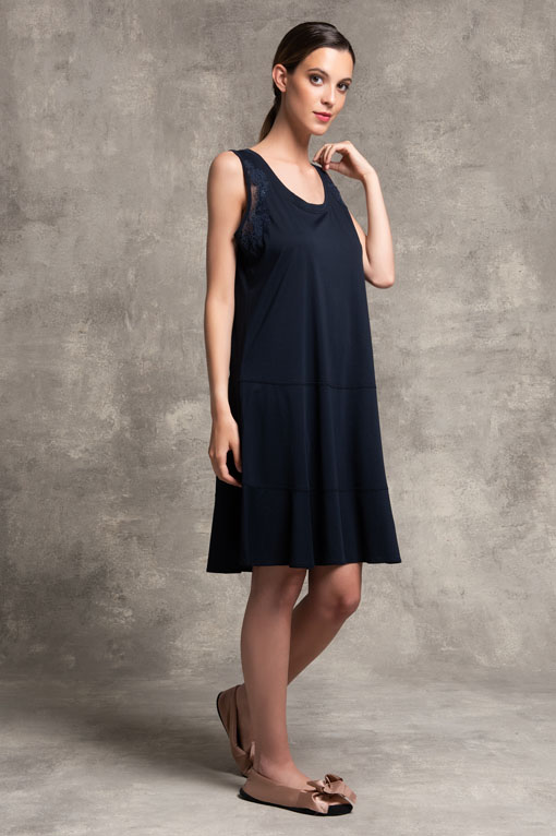 Morbido baby doll elasticizzato, decolleté impreziosito da inserto in pizzo elastico a disegno floreale. Lunghezza 85cm. 93%modal 7%elastam.